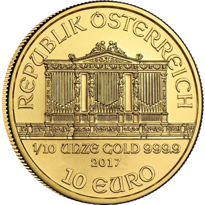 Am 10. Oktober 1989 wurden die ersten Wiener Philharmoniker im Handel angeboten. Die Münze Österreich AG in Wien produziert je nach Bedarf. Die Auflagenzahlen für die 1/10 Unze Münze schwanken über die Jahre zwischen 170.000 und 450.000 Stück pro Jahr. Die 1/10 Unze Gold Wiener Philharmoniker Münze ist offizielles Zahlungsmittel mit einem Nennwert von 10 €. Wie alle anderen Philharmoniker hat sie den höchstmöglichen Feingehalt von 999,9, d.h. aus reinem Gold. Basis für die Preisberechnung der 1/10oz Wiener Philharmoniker Goldmünze als Anlagemünze ist der aktuelle Goldpreis.