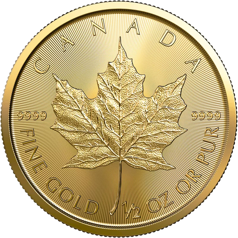 Auf der Vorderseite ist ein Ahornblatt abgebildet, rechts und links davon steht jeweils 9999, darüber CANADA und am unteren Münzrand präsentiert sich die Zweisprachigkeit in Kanada auf den Maple Leaf 1/2 Unze Gold-Münzen mit Englisch FINE GOLD, 1/2 OZ und Französisch OR PUR. Das Ahornblatt, das im Englischen Maple Leaf bedeutet, war gleichzeitig auch namensgebend für die Münzen.