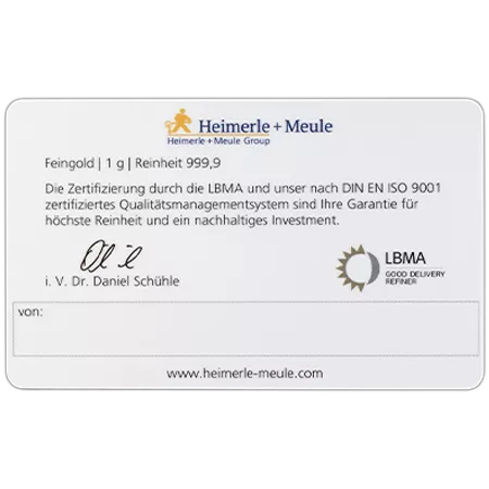 Auf der Rückseite der FineCard ist die Unterschrift von Daniel Schühle zu finden. Man kann außerdem das LBMA Siegel lesen. Diese Abkürzung steht für „London Bullion Market Association“. Das Qualitätssiegel stellt sicher, dass bei der Herstellung bestimmte Standards eingehalten werden. Sie lassen sich dadurch weltweit handeln. Man kann ebenfalls den Namen des Herstellers „Heimerle + Meule“, die Stückelung „1 g“ und die Feinheit „999.9“. Darüber hinaus kann auf dem weißen Streifen noch eine persönliche Notiz hinterlassen werden.