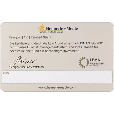 Auf der Rückseite der FineCard ist die Unterschrift des Geschäftsführers „Georg Steiner" zu finden. Man kann außerdem das LBMA Siegel lesen. Diese Abkürzung steht für „London Bullion Market Association“. Das Qualitätssiegel stellt sicher, dass bei der Herstellung bestimmte Standards eingehalten werden. Sie lassen sich dadurch weltweit handeln. Man kann ebenfalls den Namen des Herstellers „Heimerle + Meule“, die Stückelung „1 g“ und die Feinheit „999.9“. Darüber hinaus kann auf dem weißen Streifen noch eine persönliche Notiz hinterlassen werden.