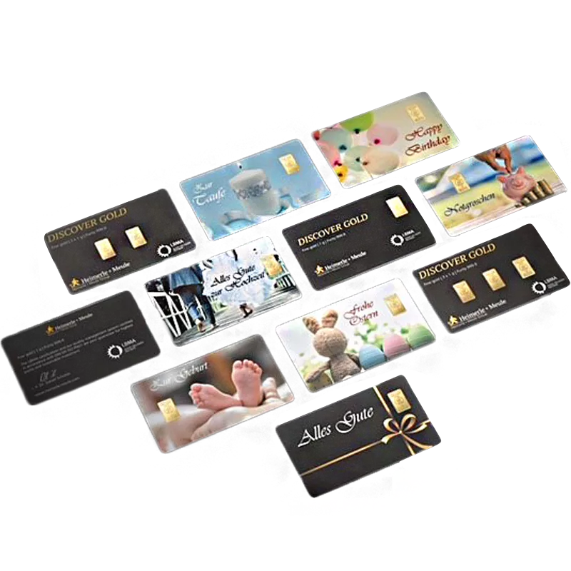 Die FineCards im Format einer Kreditkarte ist in unterschiedlichen Designs gestaltet und besticht durch ihre hochwertige Optik. Die implantierten 1g Goldbarren von Heimerle + Meule aus 999,9 Feingold sind garantiert von höchster Reinheit, was die Zertifizierung durch die LBMA eindeutig belegt. Liebe Menschen verdienen besondere Geschenke und individuelle Aufmerksamkeiten. Zeigen Sie Ihre Wertschätzung durch unsere FineCard auf eine ganz spezielle Art und Weise.