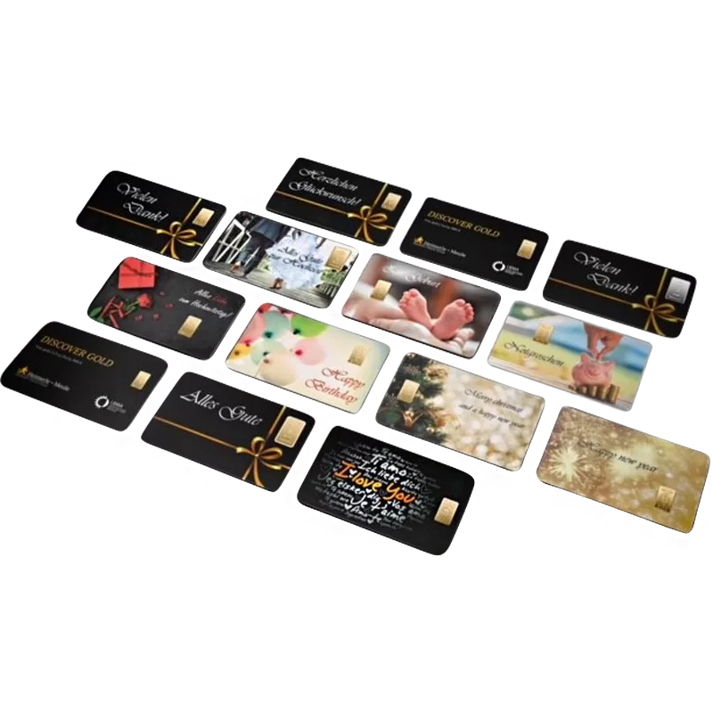 Die FineCards im Format einer Kreditkarte ist in unterschiedlichen Designs gestaltet und besticht durch ihre hochwertige Optik. Die implantierten 1g Goldbarren von Heimerle + Meule aus 999,9 Feingold sind garantiert von höchster Reinheit, was die Zertifizierung durch die LBMA eindeutig belegt. Liebe Menschen verdienen besondere Geschenke und individuelle Aufmerksamkeiten. Zeigen Sie Ihre Wertschätzung durch unsere FineCard auf eine ganz spezielle Art und Weise.