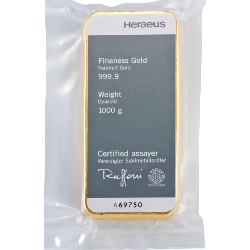 Der 1 kg Goldbarren Heraeus besteht aus 999,9 Feingold und wird nach höchsten Qualitätsstandards gefertigt. Jeder Barren trägt das Heraeus-Logo, den Feingehalt und eine individuelle Seriennummer, die die Echtheit garantiert.