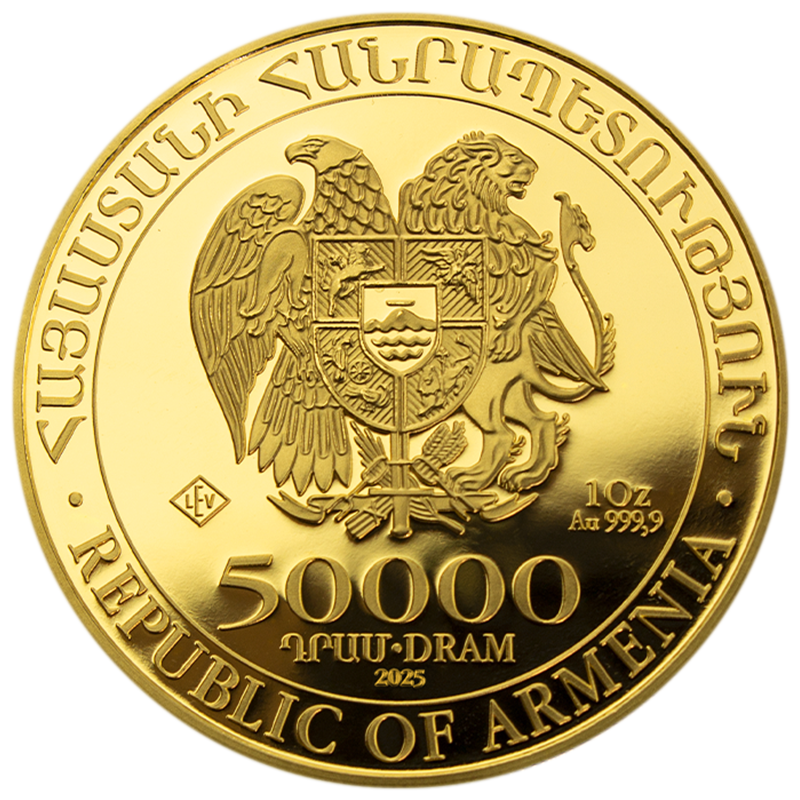 Die Rückseite dieser exklusiven Münzedition zeigt das Wappen der Republik Armenien. Unterhalb findet sich der Nominalwert in armenischen Dram, das Feingewicht, die Reinheit, sowie das Prägejahr so wie das Symbol der Prägestätte.