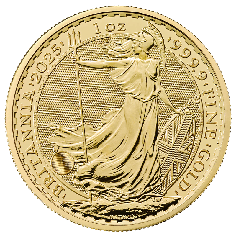 Die Motivseite zeigt jährlich das Bild der britischen Nationalfigur Britannia mit korinthischem Helm und Gewand. In der rechten Hand der kriegerischen Frauengestalt in Rüstung sehen wir einen Dreizack, mit dem sie über die Meere herrscht. In ihrer linken Hand hält sie ein Schild mit Großbritanniens Flagge – der Union Jack – und einen kleinen Ölzweig. Die Britannia steht für Weisheit und eine staatliche Gemeinschaft und ist die weibliche Verkörperung der Britischen Inseln. Das Design stammt von Philip Nathan, der das Motiv im Jahre 1987 entworfen hat. Sein Nachname ist in Großbuchstaben unterhalb der Britannia geprägt. In der Randinschrift sehen wir den Namen „BRITANNIA“, das Prägejahr „2025“ sowie Feingewicht und Feingehalt „1oz 999.9 FINE GOLD".
