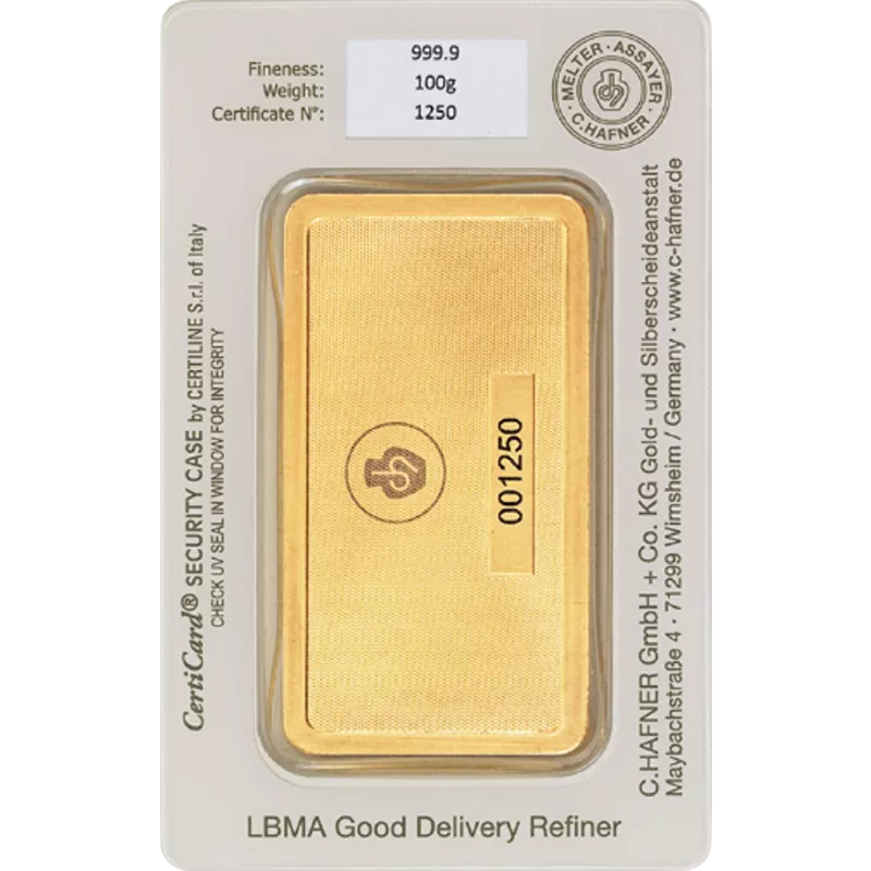 Die Goldbarren von C.HAFNER tragen auf der Vorderseite das Firmenlogo, das Gründungsjahr “seit 1850”, das Herkunftsland “GERMANY”, das Feingewicht “100 g” und die Feinheit “Feingold 999,9” Auf dem Blister ist der LBMA Status vermerkt. Bei der Zertifizierung von LBMA wird sichergestellt, dass die Barren nach strengen, internationalen Kriterien gefertigt werden.