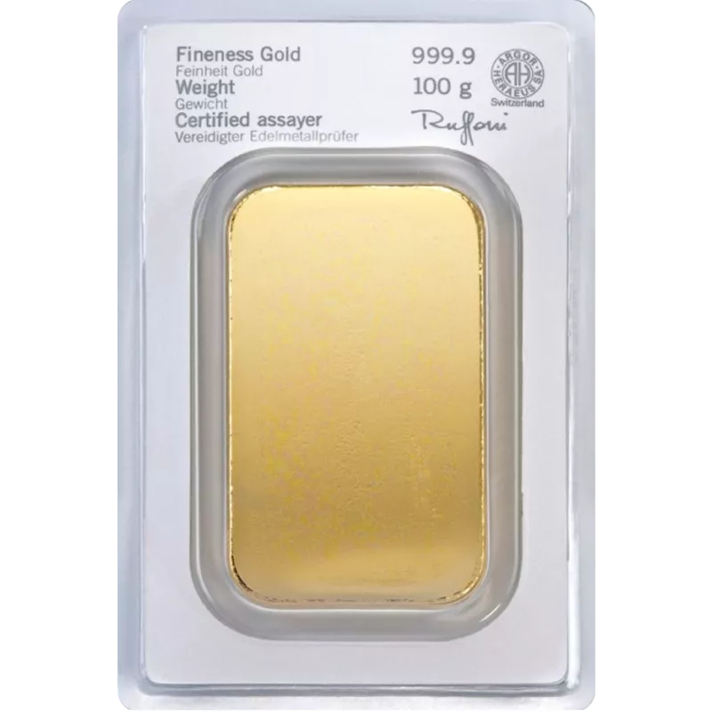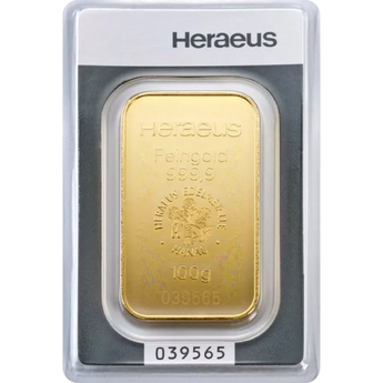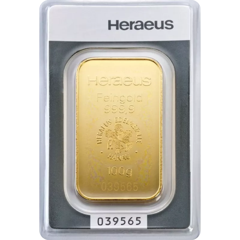 Der geprägte 100 g Goldbarren von Heraeus besteht aus 999,9 Feingold und entspricht damit den höchsten internationalen Qualitätsstandards im Edelmetallbereich.