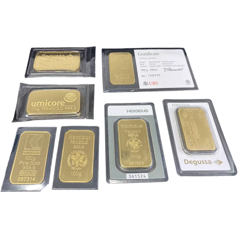 Diverse 100-Gramm-Goldbarren – Mit und ohne Zertifikat
