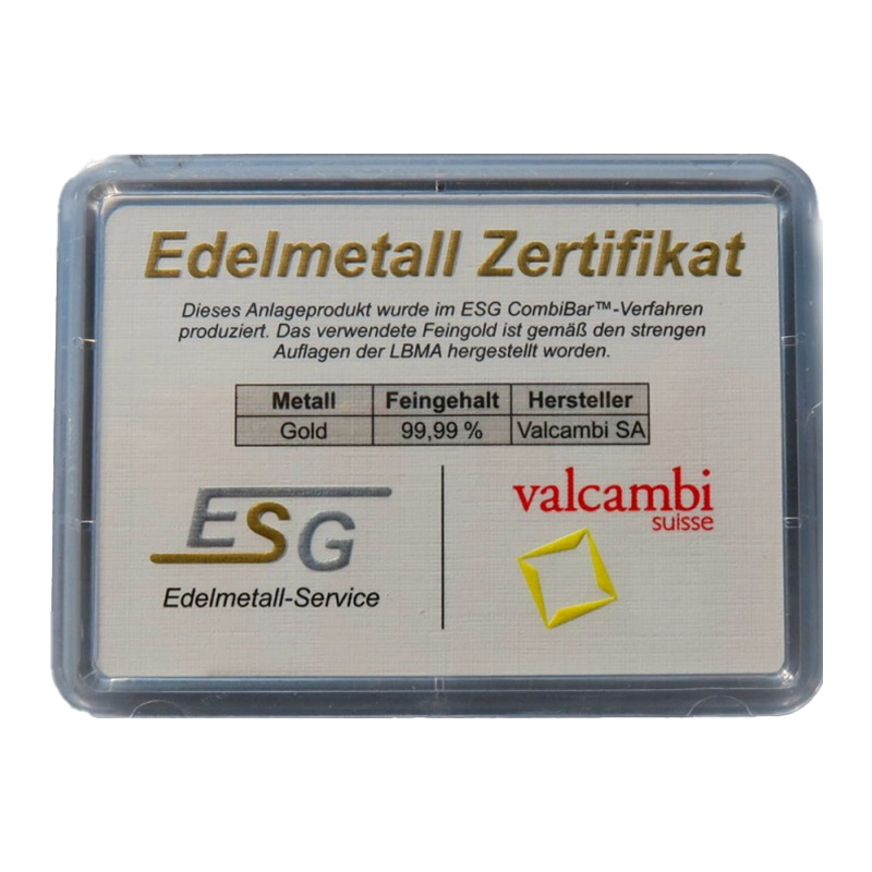 Der Combibar besteht aus 100 einzelnen 0,5 g Einheiten und enthält somit insgesamt 50 g reines Feingold mit einem Reinheitsgrad von 999,9/1000.
