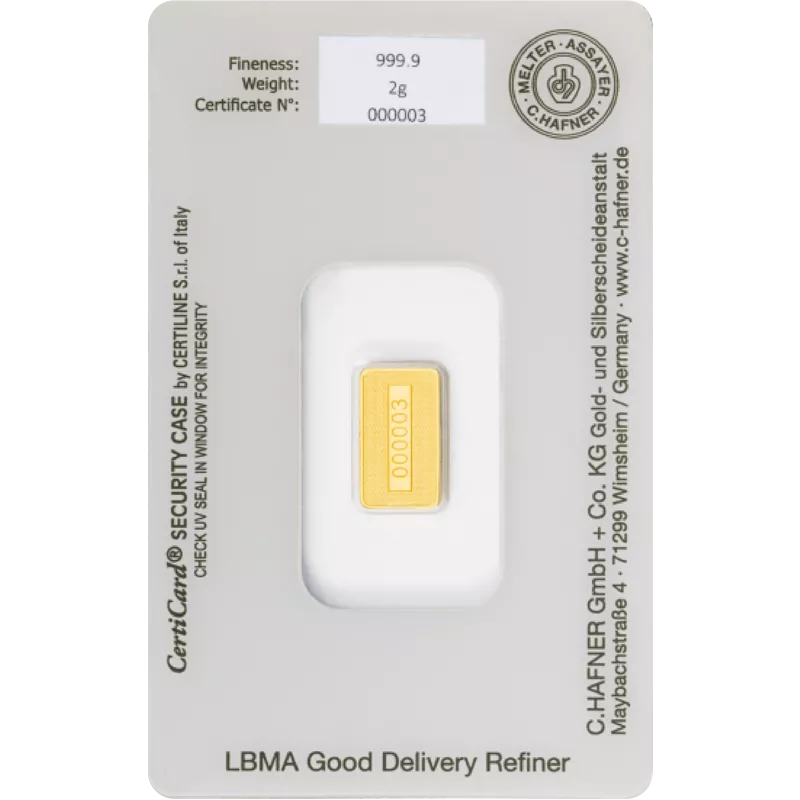 Die Goldbarren von C.HAFNER tragen auf der Vorderseite das Firmenlogo, das Gründungsjahr “seit 1850”, das Herkunftsland “GERMANY”, das Feingewicht “2 g” und die Feinheit “Feingold 999,9” Auf dem Blister ist der LBMA Status vermerkt. Bei der Zertifizierung von LBMA wird sichergestellt, dass die Barren nach strengen, internationalen Kriterien gefertigt werden.