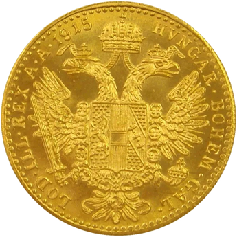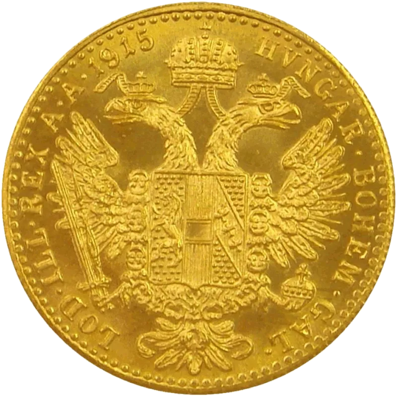 Auf der Rückseite der 1 Dukaten Goldmünzen ist das Wappen des Kaiserreichs Österreich abgebildet, das einen doppelköpfigen Adler mit einem Wappenschild beinhaltet. Über den beiden Köpfen des Adlers ist die Rudolfskrone zu erkennen, wie die Krone des Kaisers von Österreich genannt wird. Der Adler hält in einer Kralle einen Reichsapfel und in der anderen ein Reichsschwert. Entlang dem Münzrand ist die Umschrift LOD ILL REX AA 1915 HVNGAR BOHEM GAL eingeprägt, dies bedeutet übersetzt: König von Lodomerien, Illyrien, Ungarn, Böhmen und Gallizien.