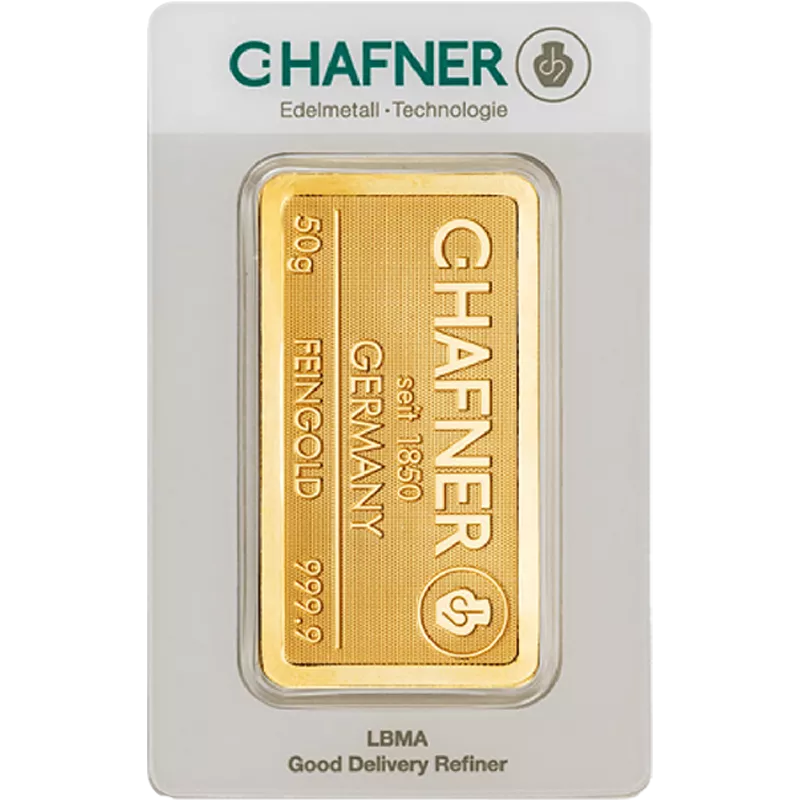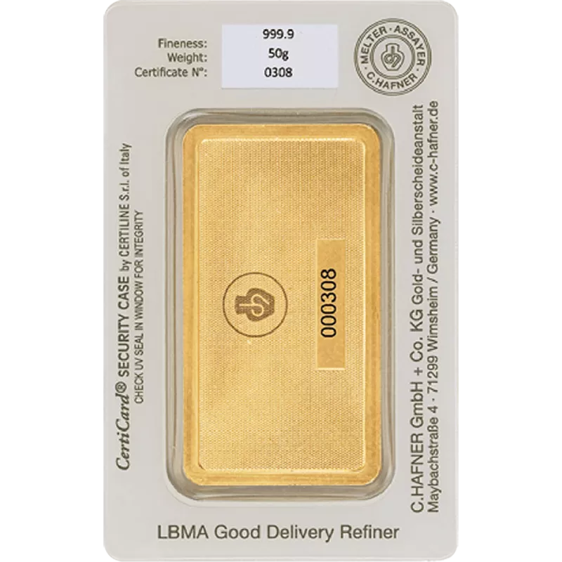 Die Goldbarren von C.HAFNER tragen auf der Vorderseite das Firmenlogo, das Gründungsjahr “seit 1850”, das Herkunftsland “GERMANY”, das Feingewicht “50 g” und die Feinheit “Feingold 999,9” Auf dem Blister ist der LBMA Status vermerkt. Bei der Zertifizierung von LBMA wird sichergestellt, dass die Barren nach strengen, internationalen Kriterien gefertigt werden.