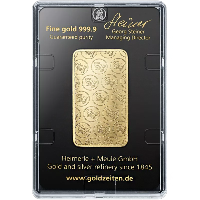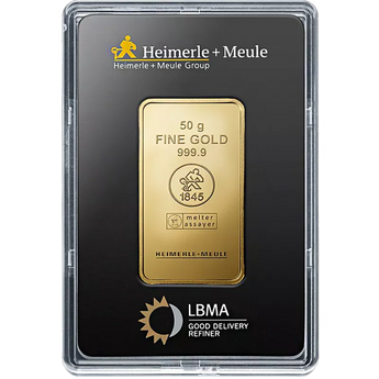 Wählen Sie den 50 g Goldbarren von Heimerle & Meule: Ein Investment in geprüfte, glänzende Qualität – gefertigt von einem Pionier der deutschen Edelmetallbranche.