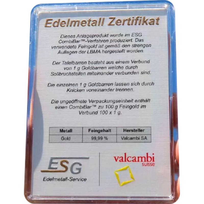 Die 100g Combi-Barren werden in der Schweiz von Valcambi, einem der grössten LBMA zertifizierten Goldbarrenprägeanstalten der Welt produziert. Der Vorteil gegenüber dem Kauf grösserer Stückzahlen normaler 1g Mini-Goldbarren liegt im Preis und in der komfortableren Lagerfähigkeit. Durch das DIN A8 Format der ESG-Tafelbarren lassen sich diese optimal in Tresoren und Schliessfächern stapeln.