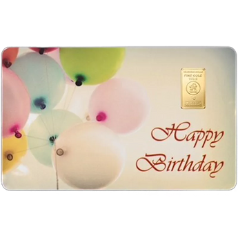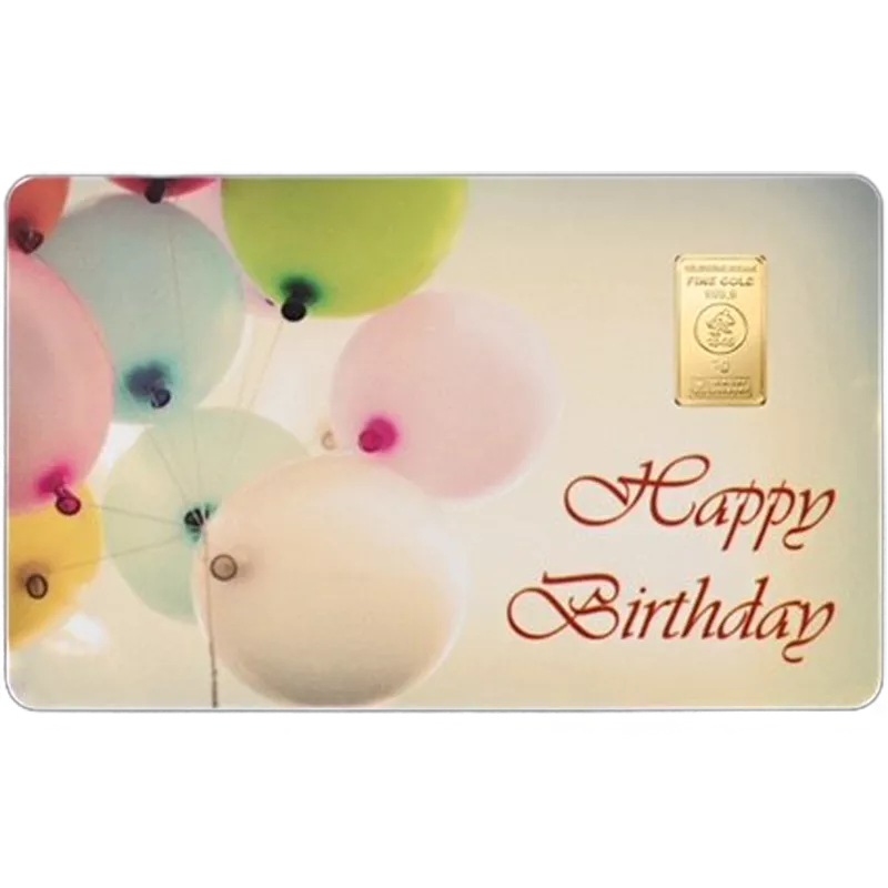 Die Vorderseite der FineCard von Heimerle + Meule ist mit dem Schriftzug „Happy Birthday“ versehen. Auf der linken Seite der Karte sind verschieden farbige Luftballons abgebildet. In der rechten oberen Seite befindet sich der Goldbarren. Auf diesem ist der Hersteller „HEIMERLE + MEULE“, die Feinheit „FINE GOLD 999,9“, das Logo mit dem Gründungsjahr „1845“, das Gewicht „1g“, sowie der Schriftzug „Melter Assayer“. Das ist Englisch und bedeutet „Schmelzprüfer“. Die gesamte FineCard ist in einem Kreditkartenformat mit den Abmessungen 85,6 mm x 54,0 mm x 1,0 mm.