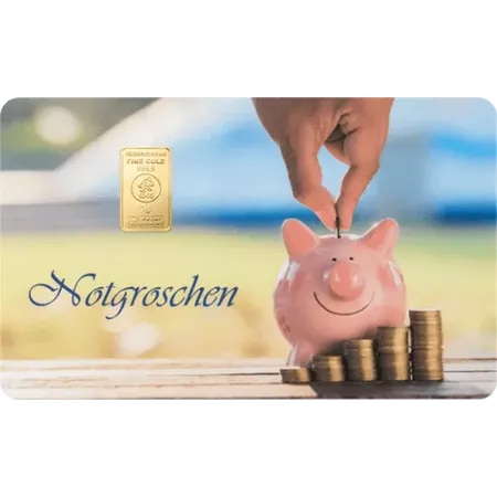 Die Vorderseite der FineCard von Heimerle + Meule ist mit dem Schriftzug „Notgroschen“ versehen. Auf der rechten Seite der Karte ist ein Sparschwein zu sehen. Vor diesem liegen 4 Stapel mit Münzen. Auf der linken oberen Seite befindet sich der Goldbarren. Auf diesem ist der Hersteller „HEIMERLE + MEULE“, die Feinheit „FINE GOLD 999,9“, das Logo mit dem Gründungsjahr „1845“, das Gewicht „1g“, sowie der Schriftzug „Melter Assayer“. Das ist Englisch und bedeutet „Schmelzprüfer“. Die gesamte FineCard ist in einem Kreditkartenformat mit den Abmessungen 85,6 mm x 54,0 mm x 1,0 mm.