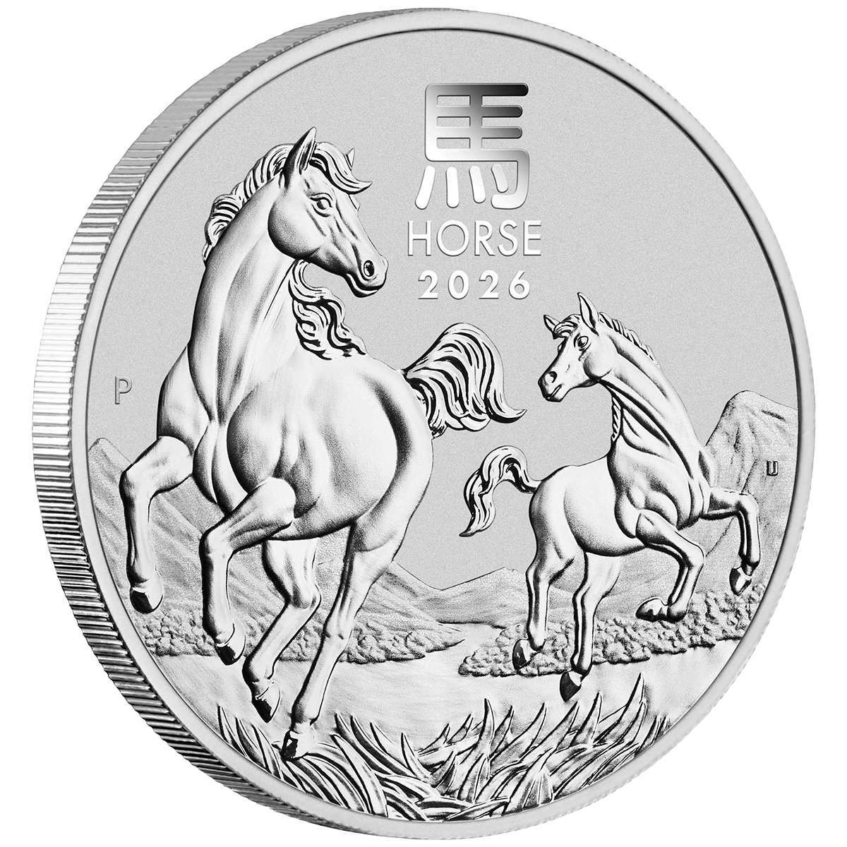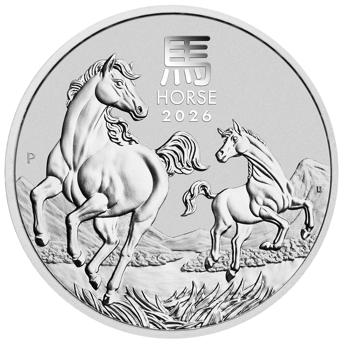 Motivseite (Revers): Im Gegensatz zur Goldausgabe zeigt das Motiv der Silbermünze eine majestätische Stute, die elegant mit ihrem Fohlen galoppiert. Ihre fließenden Mähnen unterstreichen die Dynamik der Bewegung, während der Hintergrund eine Szenerie aus Bergen und üppigen Weiden bildet. Die Darstellung verkörpert die fürsorglichen und dynamischen Qualitäten des Zeichens. Das Design beinhaltet zudem die Inschrift „HORSE 2026“ sowie das chinesische Schriftzeichen für „Pferd“ und das berühmte „P“-Münzzeichen der Perth Mint.